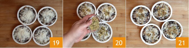 et une cuillère à café de Grana Padano râpé 19. Terminez avec les éclats de pistache 20 et enfournez environ 15 minutes, en gratinant les dernières minutes de cuisson avec le gril pour dorer la surface. Sortez du four les cocottes de chou-fleur et radicchio avec pistaches, et servez-les chaudes 21.