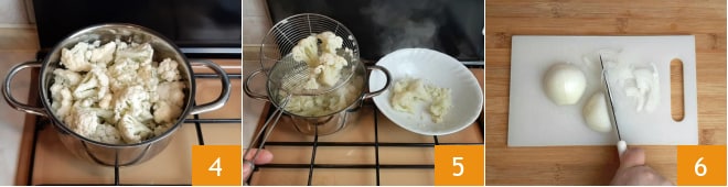 Mettez une casserole pleine d'eau sur le feu et dès qu'elle bout, plongez-y les fleurettes de chou-fleur 4 en les faisant cuire environ 10 minutes ; la consistance devra rester plutôt al dente, car elles seront sautées à la poêle, puis poursuivront la cuisson au four. Égouttez le chou-fleur dans un bol et mettez-le de côté 5. Épluchez l'oignon et émincez-le finement 6.