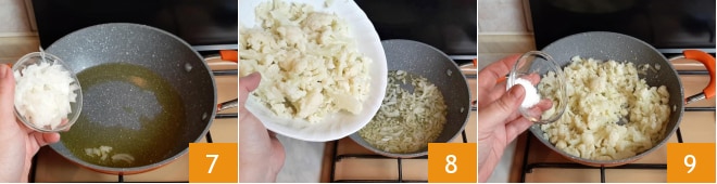 Chauffez un filet d'huile dans une poêle, ajoutez l'oignon 7 et faites-le revenir à feu doux, dans une grande poêle. Dès que l'oignon est doré, ajoutez le chou-fleur 8, rectifiez l'assaisonnement avec du sel 9