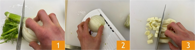 Pour préparer le gratin de fenouil, commencez par nettoyer les fenouils : retirez la partie verte 1 et divisez-les en deux, puis tranchez-les finement à la mandoline pour obtenir des tranches très fines et régulières 2. Coupez la provola d'abord en tranches puis en dés 3.