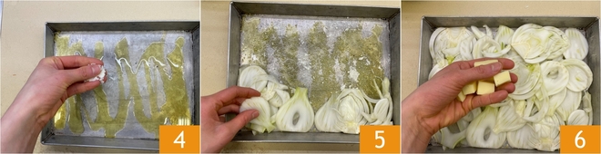 Prenez un plat de 20x30 cm, versez l'huile d'olive extra vierge au fond 4 et répartissez uniformément une poignée de fromage râpé 5. Disposez une première couche de fenouil en essayant de couvrir toute la surface 6.