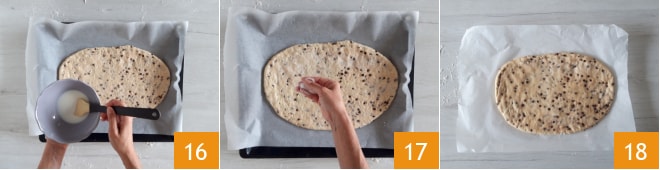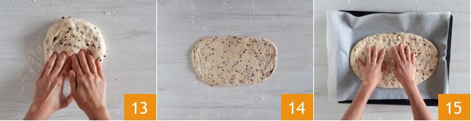 Aplatissez de nouveau la pâte avec les mains 13 et obtenez un rectangle d'environ 2 centimètres d'épaisseur 14. Transférez la pâte sur une plaque recouverte de papier sulfurisé 15.