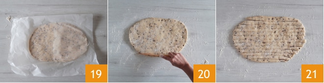 Une fois le temps de levée écoulé, renversez délicatement la pâte sur une planche farinée 19 et retirez délicatement le papier sulfurisé. Avec une roulette à lame lisse, coupez des bandes de pâte d'environ 1,5 centimètres de large 20 21.