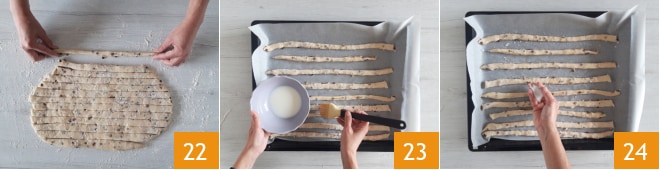 Allongez délicatement chaque bande avec les mains jusqu'à atteindre la longueur souhaitée, environ 30 centimètres 22. Disposez les gressins sur une plaque recouverte de papier sulfurisé, en les espaçant légèrement les uns des autres. Badigeonnez les gressins avec le lait 23 et saupoudrez avec le sucre 24.
