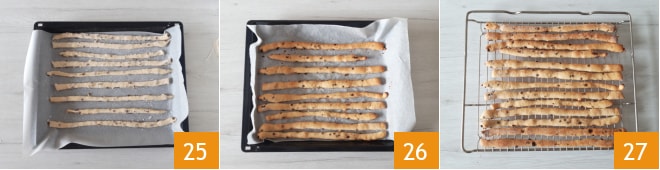 Laissez lever de nouveau pendant 1 heure 25. Faites cuire dans un four ventilé préchauffé à 180° pendant environ 20 minutes. Sortez les gressins 26 et laissez-les refroidir complètement sur une grille avant de les servir 27.