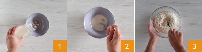 Pour préparer les gressins au chocolat, commencez par la pâte. Émiettez la levure de bière et dissolvez-la dans 30 g de lait prélevés de la quantité totale 1 2. Versez la farine dans un bol 3.
