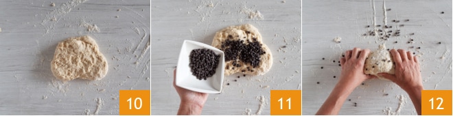 Aplatissez un peu la pâte 11, ajoutez les pépites de chocolat 11 et pétrissez jusqu'à ce qu'elles soient bien incorporées 12.