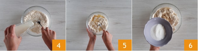 Au centre, versez le lait dans lequel vous avez dissous la levure. Mélangez avec une cuillère puis ajoutez, en filet, le reste du lait 4. Enfin, versez l'huile 5. Mélangez et ajoutez également le sucre 6.