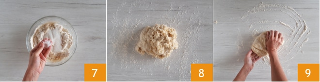 Ajoutez aussi le sel fin 7, travaillez rapidement puis transférez sur un plan 8 et pétrissez pendant environ 10 minutes 10.