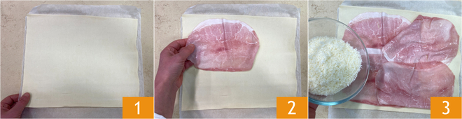 Pour préparer les gressins de feuilletée, déroulez la pâte feuilletée sur le plan de travail avec son papier sulfurisé 1. Disposez les tranches de jambon sur toute la surface, en veillant à laisser 1 cm libre le long des bords 2, puis saupoudrez de Parmigiano Reggiano râpé 3.