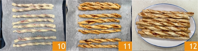 Transférez les gressins au fur et à mesure sur une plaque recouverte de papier sulfurisé 10 et faites cuire dans un four ventilé préchauffé à 170° pour environ 25 minutes. Une fois dorés, sortez-les du four 11 et laissez tiédir. Vos gressins de feuilletée sont prêts à être servis, froids ou tièdes 12 !