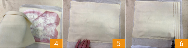 Recouvrez avec le second rouleau de pâte feuilletée 4 et scellez les bords en pressant avec les doigts 5. À l'aide d'une roulette à pâtisserie, découpez des bandes d'environ 1 cm de large 6.