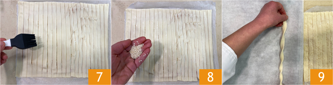 Badigeonnez la surface avec de l'eau 7 et saupoudrez-la de graines de sésame 8. À ce stade, prenez une bande à la fois et enroulez-la pour former une spirale 9.