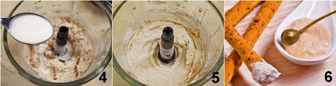 Détendez la crème avec deux cuillères à soupe de crème fraîche 4. Une fois obtenu un mélange crémeux 5, versez-le dans une coupelle d'apéritif, garnissez avec les fleurs de câpres et accompagnez avec les sfilati à la tomate 6.