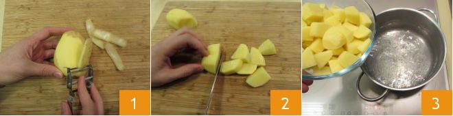 Pour préparer le gröstl à la tyrolienne, commencez par les pommes de terre. Épluchez-les avec un épluche-légumes ou un couteau d'office 1 puis coupez-les en morceaux d'environ deux centimètres 2. Plongez-les dans une casserole d'eau bouillante et faites-les cuire pendant une vingtaine de minutes 3.