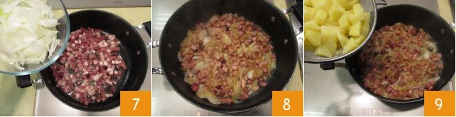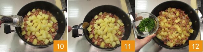 Ajoutez les oignons 7 et laissez cuire le tout pendant 15 minutes à feu moyen-vif, en remuant de temps en temps 8. Pendant ce temps, les pommes de terre seront également cuites, égouttez-les puis plongez-les dans la préparation 9.