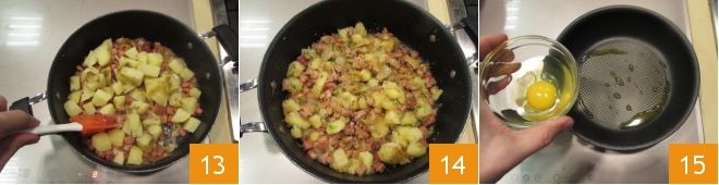 mélangez et laissez encore infuser quelques instants 13. Votre gröstl est prêt 14, il ne manque que l'œuf au plat. Dans une petite poêle avec un filet d'huile, versez un œuf à la fois d'un petit bol 15.
