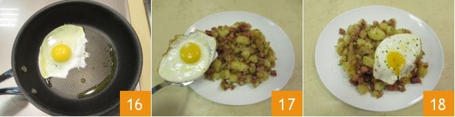 Faites-le cuire pendant 3-4 minutes 16 puis déposez l'œuf sur chaque portion 17. Parfumez avec une pincée de poivre et encore un peu de ciboulette, et votre gröstl à la tyrolienne est enfin prêt à être dégusté 18 !
