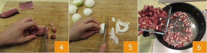 Entre-temps, coupez le speck en dés d'environ 1 cm de côté 4. Ensuite, émincez finement l'oignon déjà épluché 5 et passez à la cuisson. Faites fondre le beurre dans une casserole sur le feu. Ajoutez ensuite les dés de lard et de speck 6.