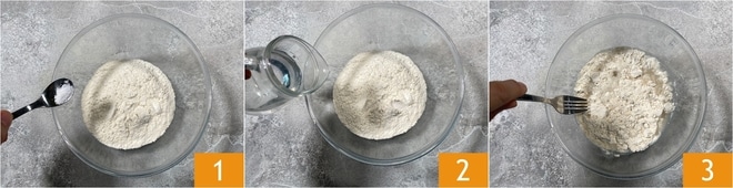 Pour préparer les gyoza aux crevettes, commencez par la pâte : dans un bol, ajoutez le sel à la farine 1, puis versez l'eau 2 et mélangez avec une fourchette 3.