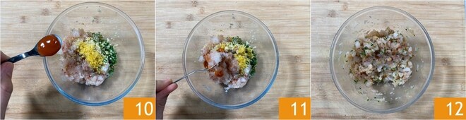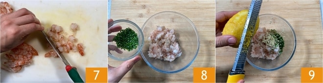Hachez la chair des crevettes au couteau 7 et transférez-la dans un bol, puis assaisonnez avec du sel, du poivre, de la ciboulette 8 et du zeste de citron 9.