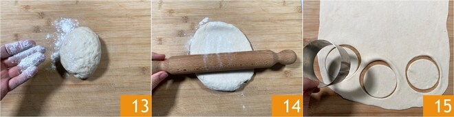 Après le temps de repos, reprenez la pâte et farinez-la légèrement 13. À l'aide d'un rouleau à pâtisserie, étalez-la en vous aidant au besoin avec un peu de farine 17, jusqu'à obtenir une épaisseur d'environ un demi-centimètre. Une fois cette épaisseur obtenue, découpez des cercles à l'aide d'un emporte-pièce de 11 cm de diamètre 18.