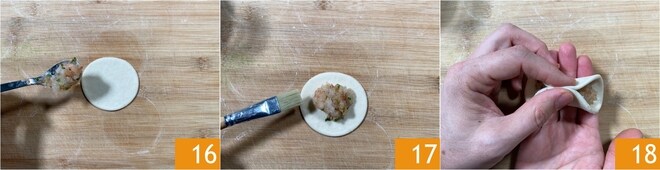 Garnissez chaque disque avec une cuillère à café de farce 19, puis badigeonnez les bords avec un peu d'eau 20 et repliez le disque en deux en scellant bien avec les doigts 21.