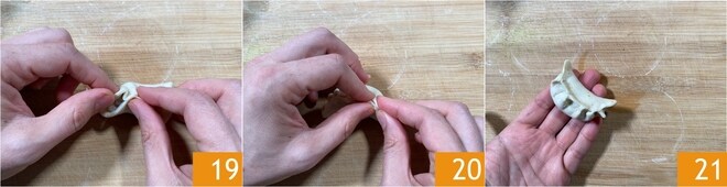Pincez les bords de la pâte ensemble d'abord du côté gauche 22 puis du côté droit 23. Une fois le premier obtenu, continuez de la même manière pour former tous les autres 24.