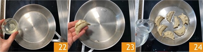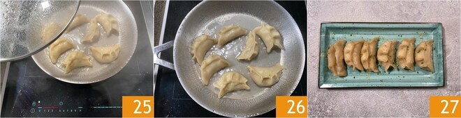 Chauffez une poêle et versez l'huile de tournesol 25, puis déposez les gyoza et faites-les dorer pendant environ 4 minutes à feu moyen, sans les toucher 26. Une fois qu'ils sont bien dorés à la base, versez l'eau dans la poêle (faites attention aux éclaboussures) 27.