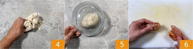 Transférez la pâte sur le plan de travail et pétrissez 4. Une fois que vous avez obtenu une boule lisse, laissez reposer à température ambiante, couverte d'un bol 5. Maintenant, occupez-vous du nettoyage des crevettes : séparez la tête de la carapace 6, puis retirez le fil intérieur.