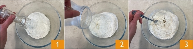 Pour réaliser les gyoza végétariens, commencez par préparer la pâte : dans un bol, mélangez la farine avec le sel 1, puis ajoutez l'eau en filet 2 tout en amalgamant le mélange avec la cuillère 3.