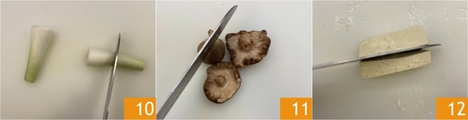 Faites de même avec l'oignon nouveau 10, les champignons 11 et le tofu 12.