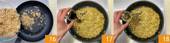 Faites chauffer un filet d'huile de tournesol dans une poêle, puis versez le mélange 16 et faites revenir à feu moyen pendant 10 minutes. Une fois ce temps écoulé, éteignez le feu et ajoutez la sauce soja 17 et l'huile de sésame 18.