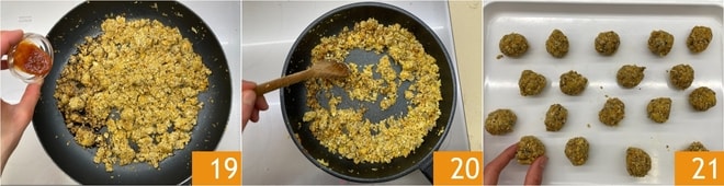Ajoutez également la sauce sriracha 19. Mélangez bien 20, puis laissez refroidir. Une fois la garniture refroidie, formez des boules d'environ 10 g chacune et disposez-les sur un plateau 21.
