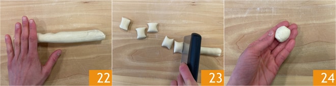 Reprenez la pâte et divisez-la en deux parties dont vous tirerez des boudins 22. Coupez les boudins en morceaux d'environ 15 g 23 et formez des boules 24.