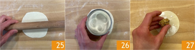 Légèrement farinez le plan de travail et étalez chaque boule avec un rouleau à pâtisserie jusqu'à une épaisseur d'environ 1 mm 25, puis découpez la pâte avec un emporte-pièce de 8 cm de diamètre 26. Placez une boule de garniture au centre 27.