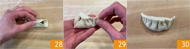 Pliquez le disque en demi-lune 28, puis pincez un des 2 bords pour former de petits plis en partant du centre vers les extrémités 29 ; pour vous aider, vous pouvez vaporiser les bords de la pâte avec un peu d'eau. Au fur et à mesure que vous fermez les gyoza 30, disposez-les sur un plateau légèrement fariné.