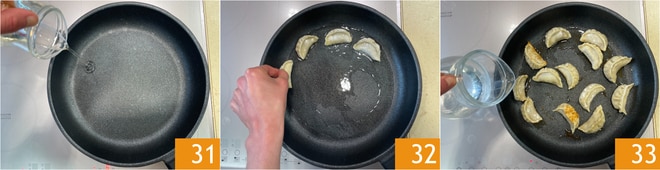 Vous êtes prêts pour la cuisson : faites chauffer une poêle avec un filet d'huile de tournesol 31, puis déposez les gyoza et faites-les dorer à feu moyen sans jamais les retourner, de sorte que seule la partie inférieure soit colorée ; cela prendra environ 4-5 minutes 32. À ce stade, versez l'eau dans la poêle 33.