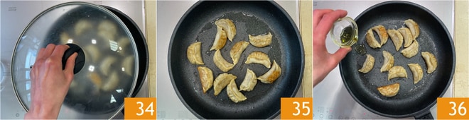 Baissez le feu et faites cuire à couvert pendant environ 10 minutes 34 ; le temps de cuisson varie selon l'épaisseur de la pâte. Une fois cuits, retirez le couvercle 35, éteignez le feu et ajoutez l'huile de sésame 36.