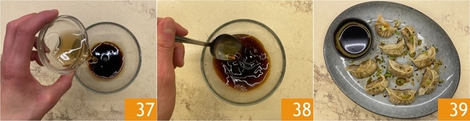 Versez dans un bol la sauce soja et le vinaigre de riz 37, mélangez 38 et servez vos gyoza végétariens avec la sauce d'accompagnement 39!