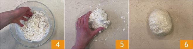 Travaillez la pâte pendant quelques minutes d'abord dans le bol 4 puis sur le plan de travail 5 jusqu'à obtenir une consistance lisse et homogène. Formez une boule, enveloppez-la dans un film plastique et laissez reposer à température ambiante 6.