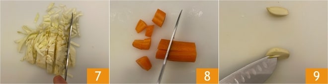 Entre-temps, occupez-vous de la garniture. Émincez et coupez en morceaux le chou blanc 7, les carottes 8 et les gousses d'ail épluchées 9.