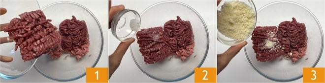 Pour réaliser les hamburgers à la friteuse à air, mélangez la viande hachée de bœuf et de porc dans un bol 1, puis ajoutez le sel 2, le poivre et le Grana Padano DOP râpé 3.