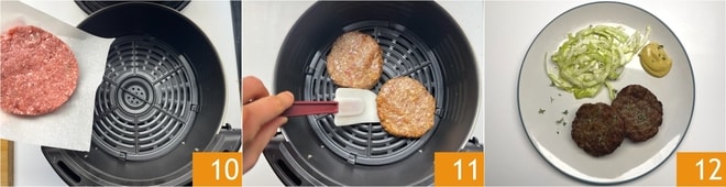 Disposez les hamburgers dans une friteuse à air en vous aidant du papier sulfurisé (nous avons utilisé une friteuse avec une capacité de 6 litres), puis retirez-le 10. Faites cuire 2 hamburgers à la fois à 200° pendant 10 minutes, en les retournant à mi-cuisson 11. Vos hamburgers à la friteuse à air sont prêts à être dégustés comme vous le souhaitez 12 !