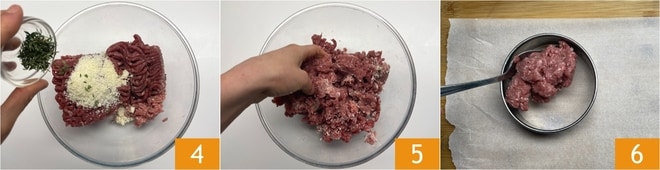 Ajoutez également le thym 4 et mélangez avec les mains pour obtenir une pâte homogène 5. Placez un emporte-pièce de 9 cm de diamètre sur une feuille de papier sulfurisé et remplissez-le avec 120 g de pâte 6.