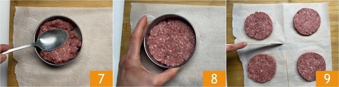 Compactez la viande avec le dos d'une cuillère ou avec un pilon, selon la consistance que vous préférez 7. Retirez délicatement l'emporte-pièce 8 et procédez de la même manière pour former les 3 autres hamburgers. À ce point, coupez le papier sulfurisé en carrés pour séparer les hamburgers et les manipuler plus facilement 9.