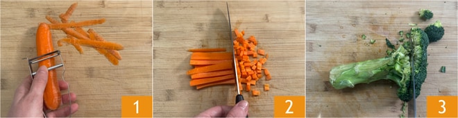 Pour préparer les hamburgers de légumes, commencez par éplucher les carottes 1 et les couper d'abord en bâtonnets puis en dés d'environ 5-7 mm 2. Séparez les fleurettes de brocoli 3.