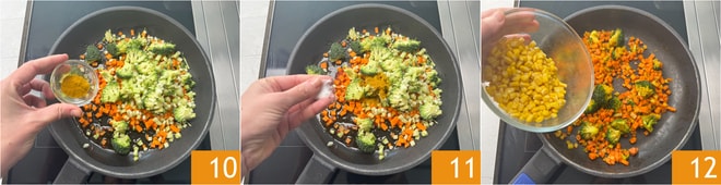 Ajoutez ensuite le curry 10, salez selon votre goût 11 et faites cuire à feu moyen-vif pendant environ 10 minutes. Ajoutez le maïs 12.