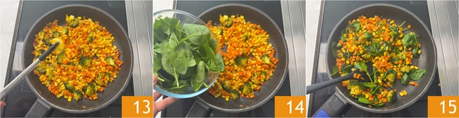 Retirez l'ail 13 et ajoutez les épinards 14. Une fois qu'ils ont ramolli, laissez cuire pendant encore 5 minutes 15.