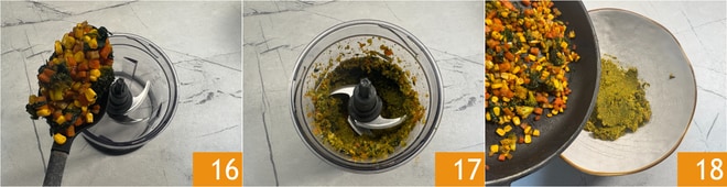 Transférez la moitié des légumes dans un mixeur 16 et mixez jusqu'à obtenir un mélange homogène 17. Transférez ensuite dans un bol et ajoutez les légumes restants 18.
